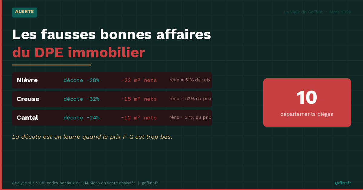 Source : La Vigie de GoFlint, Belloporto SAS. Mars 2026. 6 051 codes postaux, 96 départements, 1,1 million de biens en vente analysés. Coûts de rénovation normalisés à 500 €/m² pour la comparabilité inter-territoriale.